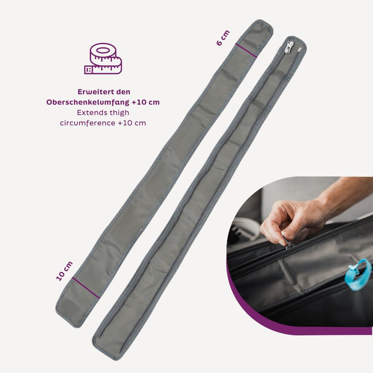 Besonders bei einem Lymphödem oder Lipödem sind unsere Körper individuell – oft sind die Umfänge an Waden, Oberschenkeln und Hüfte sehr unterschiedlich. Unsere Erweiterungslaschen schenken dir 10 cm pro Seite genau dort, wo du sie brauchst.